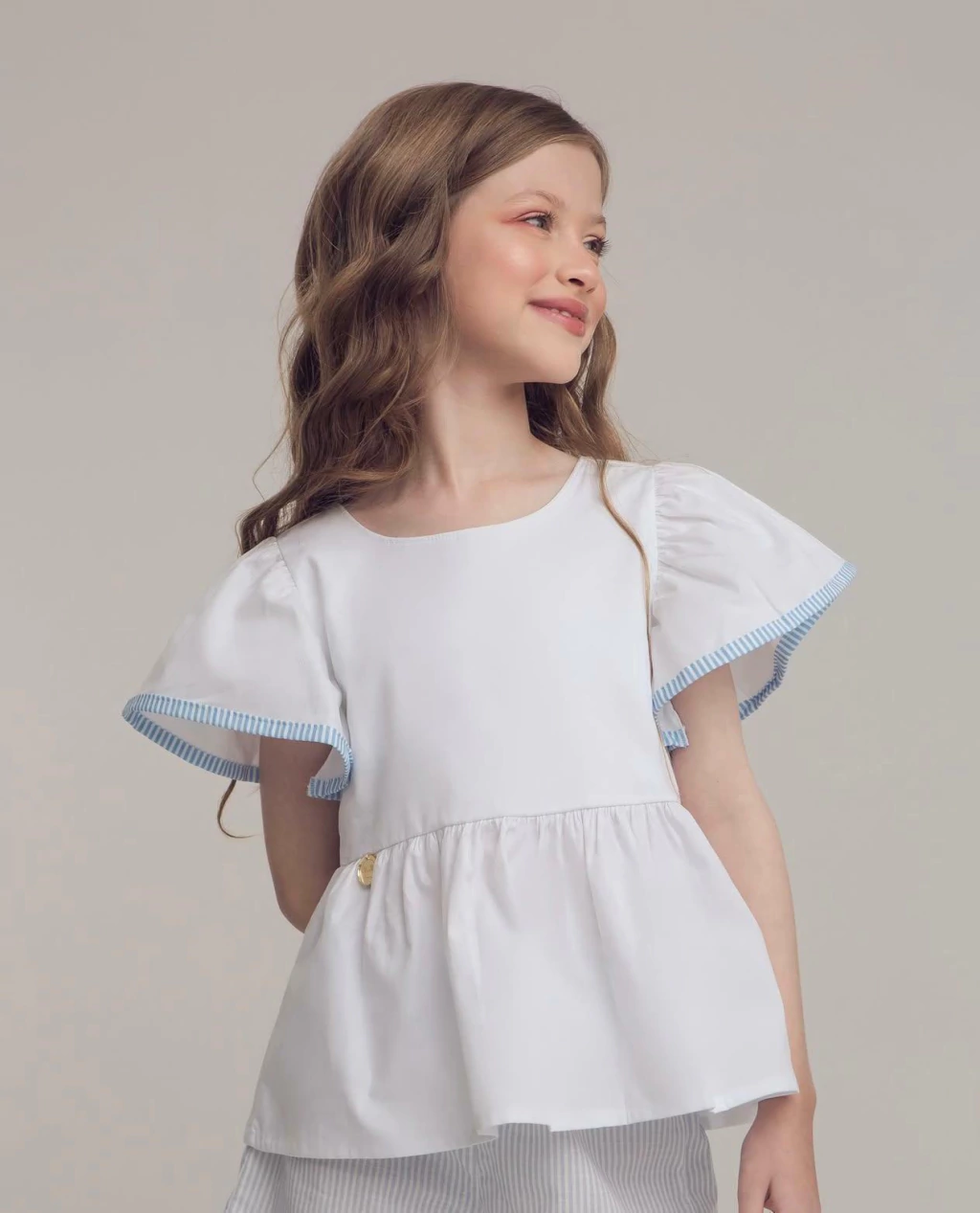 Este conjunto super romântico traz uma blusa branca no modelo batinha com detalhes delicados em azul bebê nas mangas, conferindo um toque de suavidade e elegância. O shortinho listrado em branco e azul bebê complementa o visual com estilo e frescor.