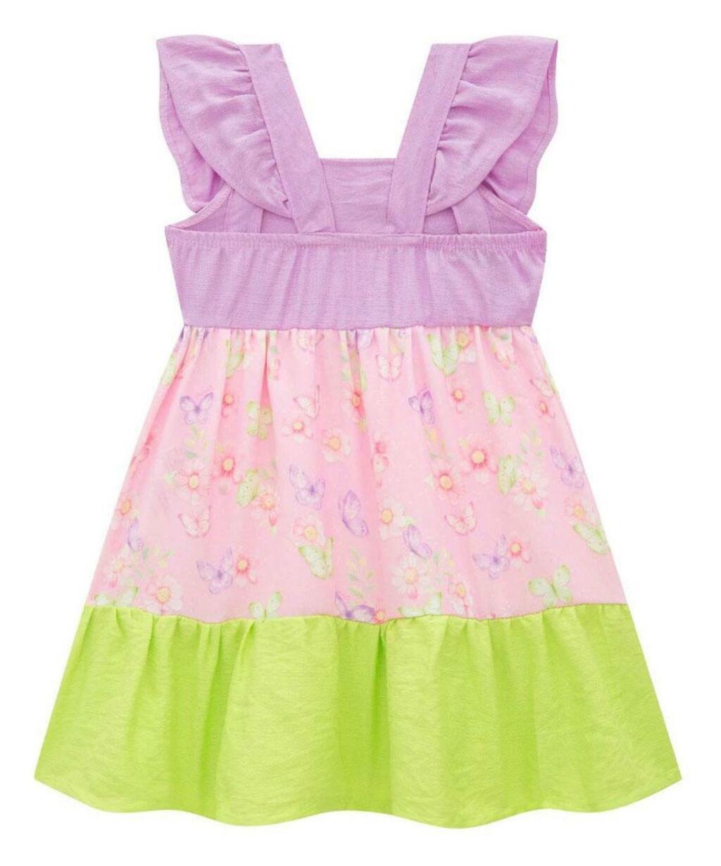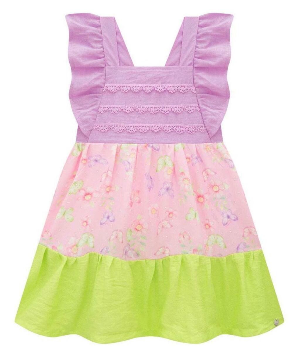O modelo apresenta um visual tricolor harmonioso: busto lilás com delicados apliques em gripir, faixa central rosa com estampa de borboletas e aplicação em strass, que trazem brilho e um toque lúdico ao look, e a barra na cor verde que completa o design com leveza e elegância.